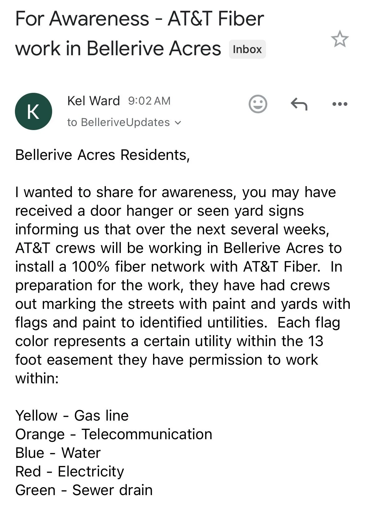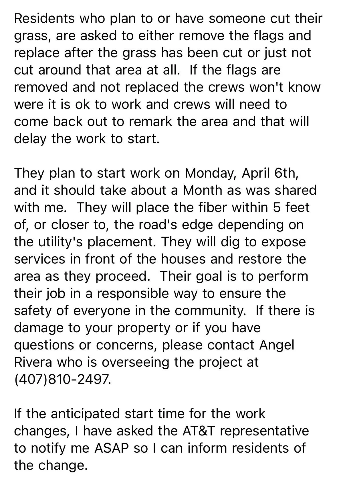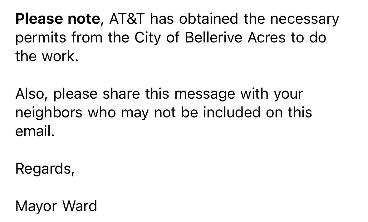 AT&T crews have now begun work around the neighborhood. For any who may have missed the official update, see details below.